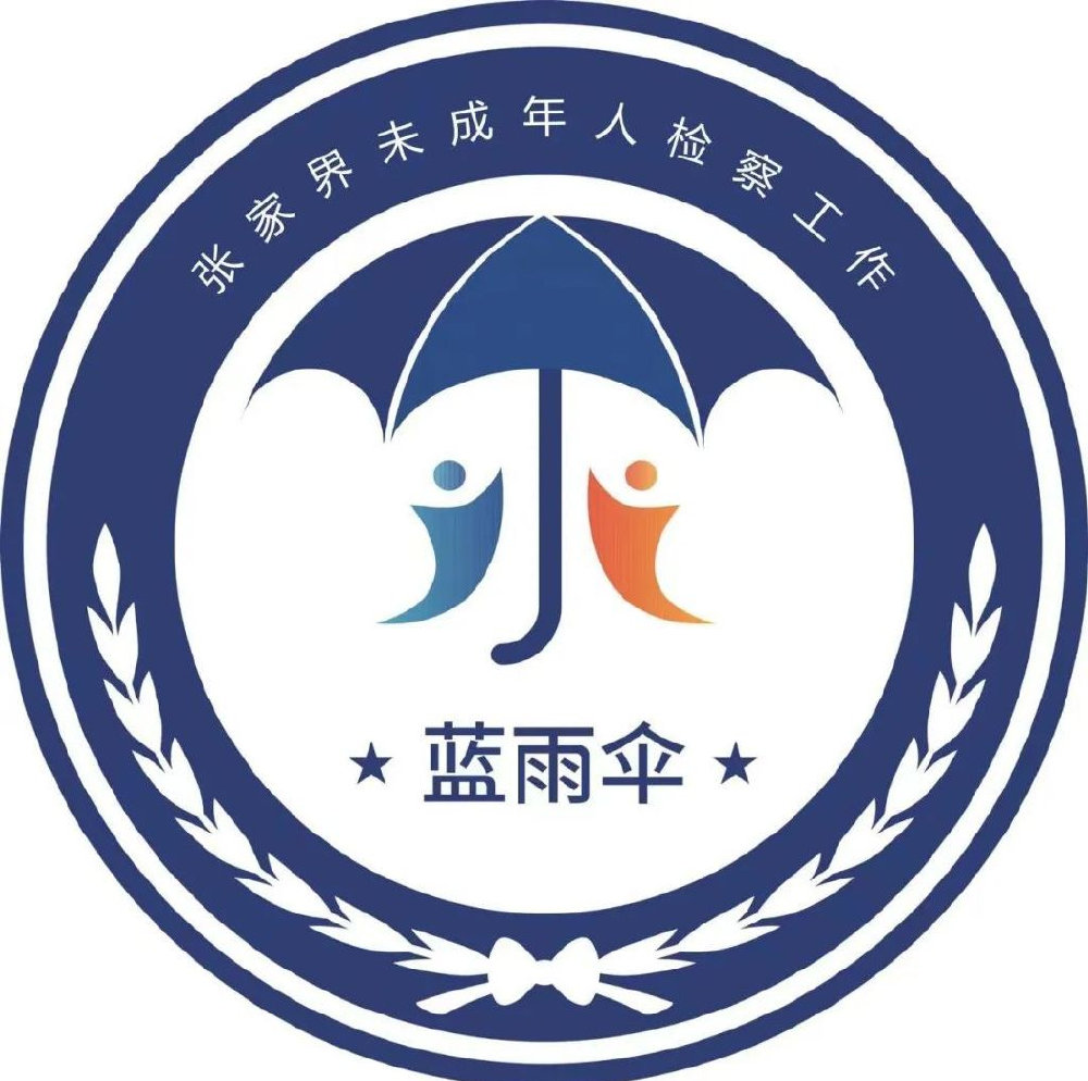 Logo以检徽为主体外形,圆环内以麦穗和文字标注张家界未成年人检察工作,中心主体以雨伞、蓝色和橙色小人、文字整合设计构成。将“检察”的首字母J、C组合设计为雨伞形态,背景色为检察蓝,Logo中心的蓝色、橙色小人分别代表男孩和女孩,他们形如跳跃,向中靠拢,聚集在蓝雨伞之下,象征检察机关撑起关爱未成年人的保护伞,呵护广大未成年人平安、健康、快乐成长。
