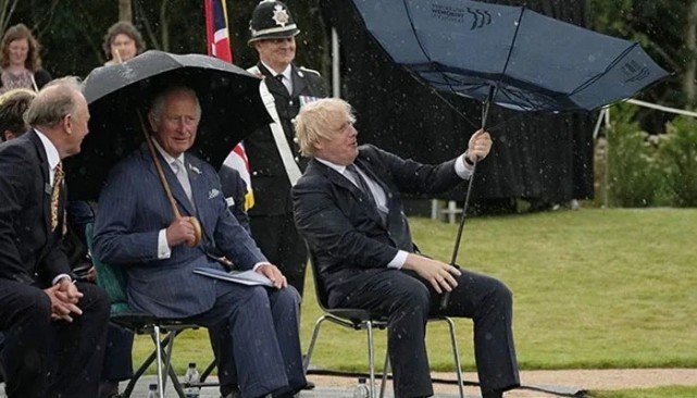 当他们一起参加为警察举行的追悼会时,约翰逊的雨伞因为狂风而“失控”了,翻了上去,而查尔斯的则是纹丝不动。看到努力想要控制雨伞的邻座,老王子绽放出了灿烂的笑容,当然在场的其他人也都笑了。而显然查尔斯所使用的伞,抵御风雨的能力更强。