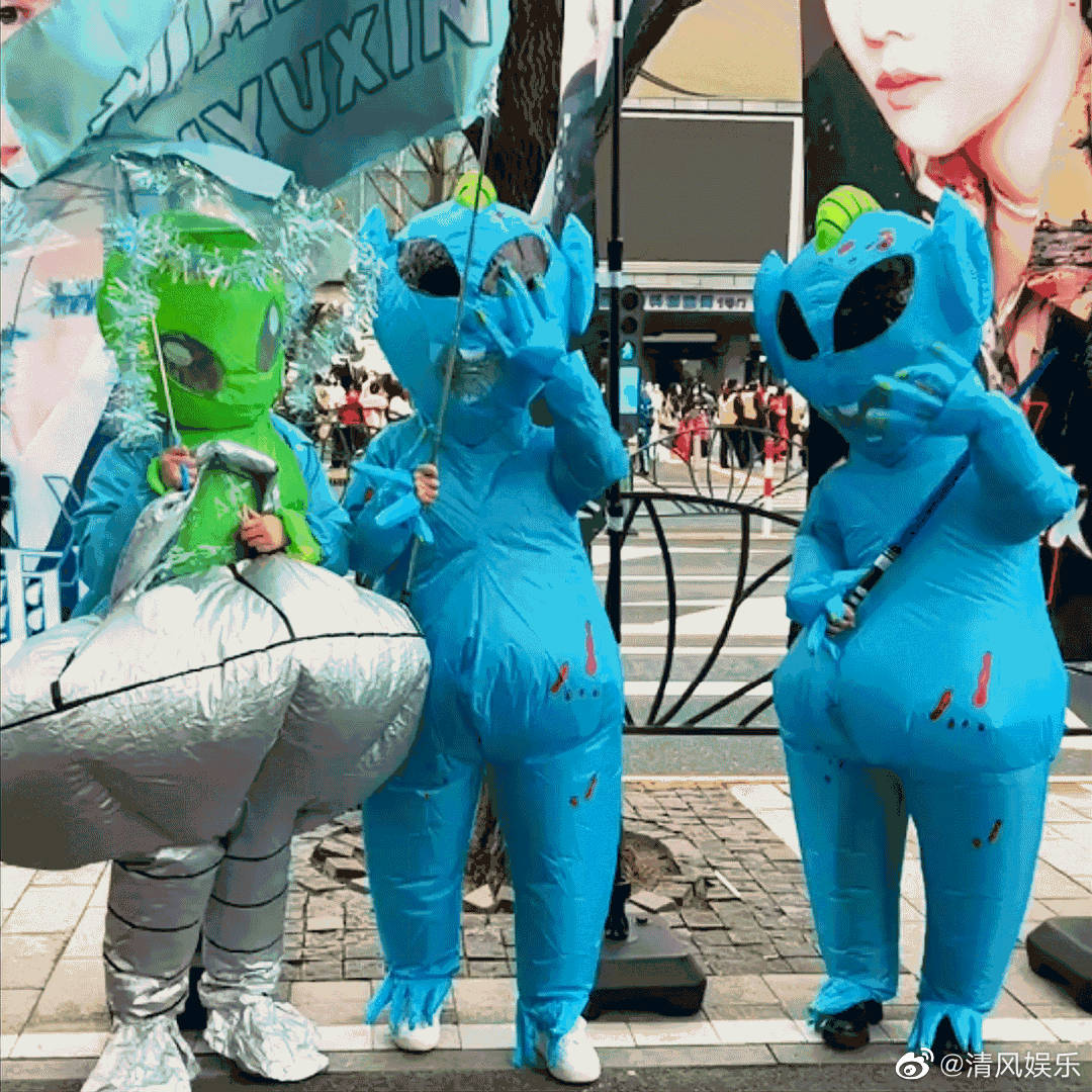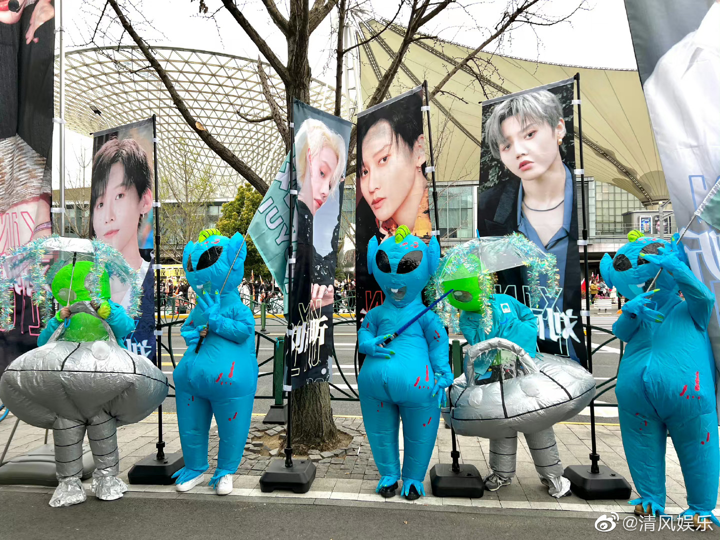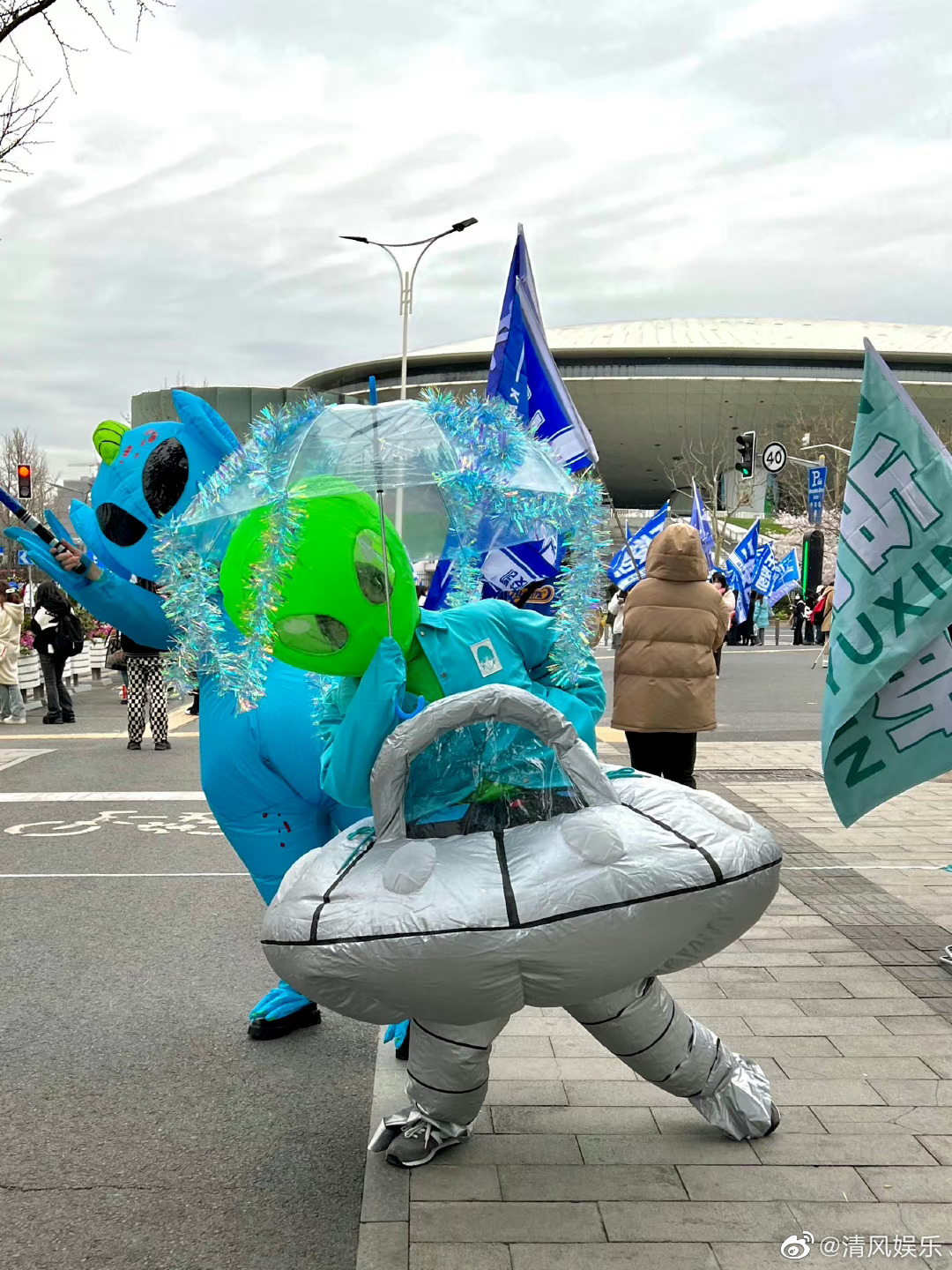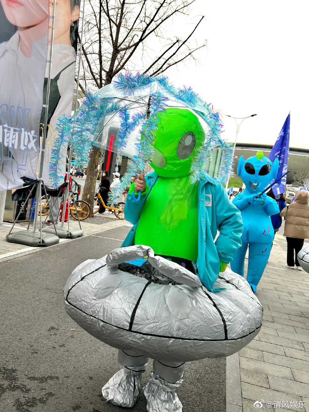 刘雨昕今日微博之夜场外应援,除了注水旗还有雨伞们扮的外星人,有被震撼到 #微博之夜场外应援好卷#